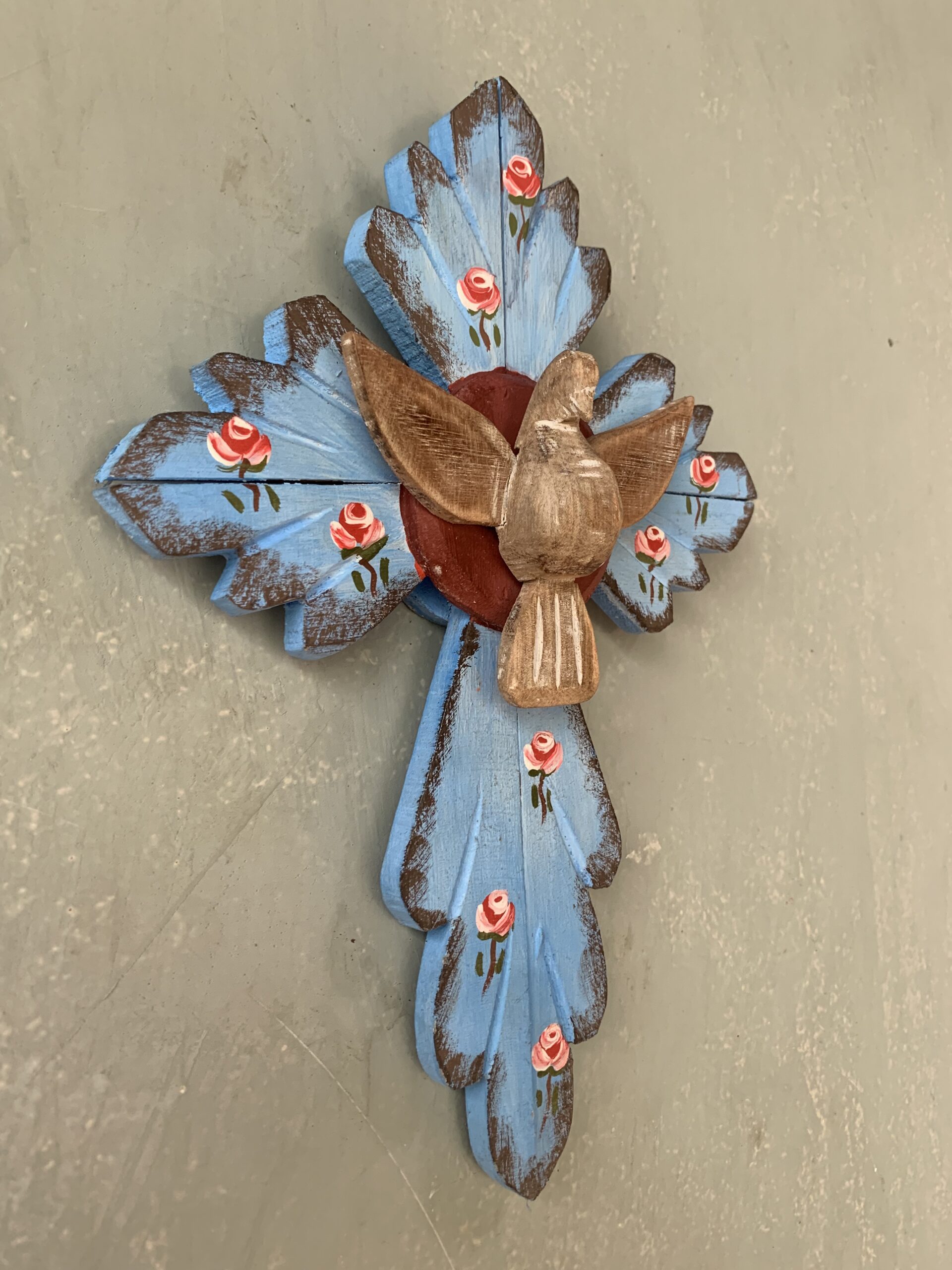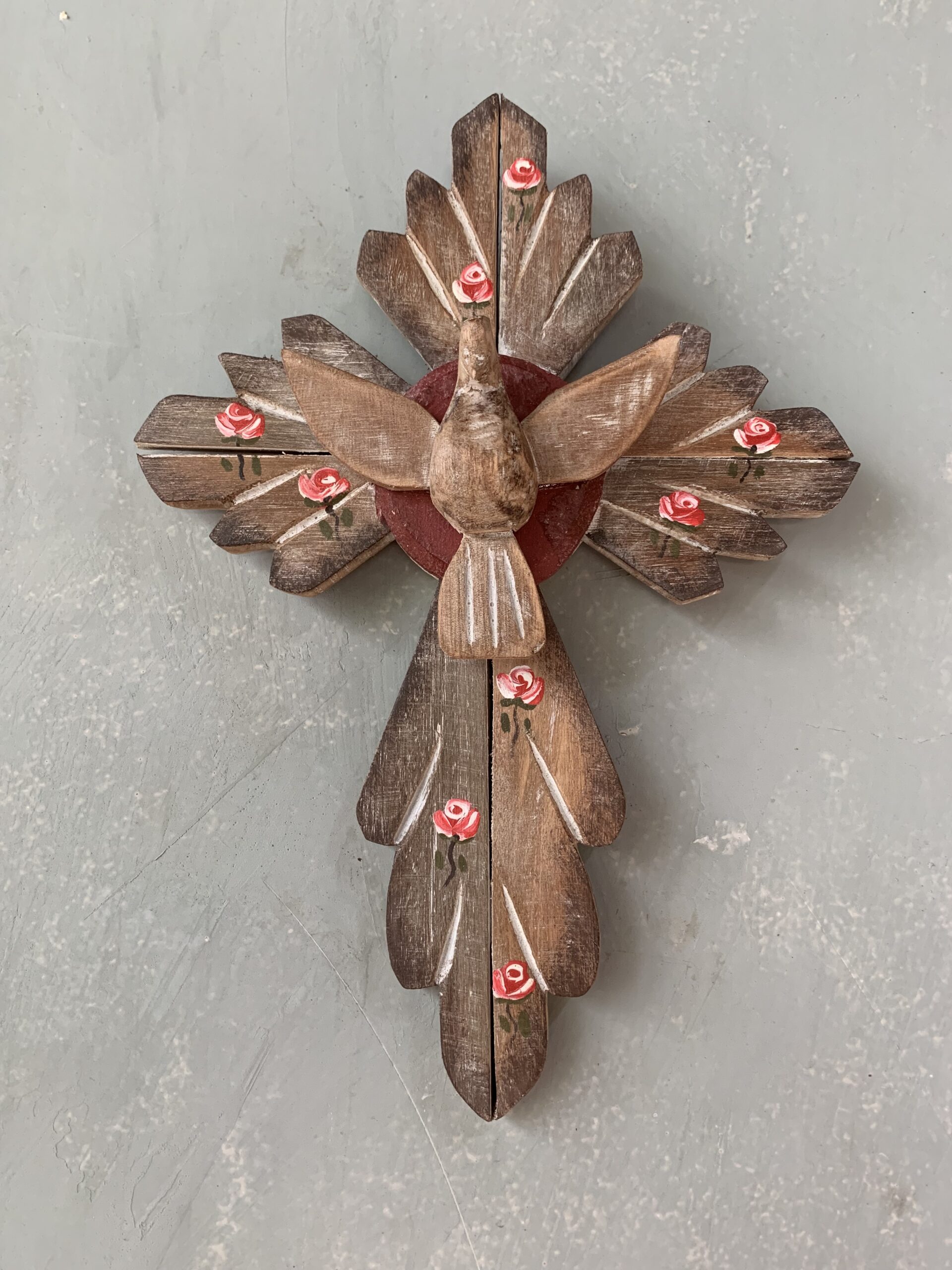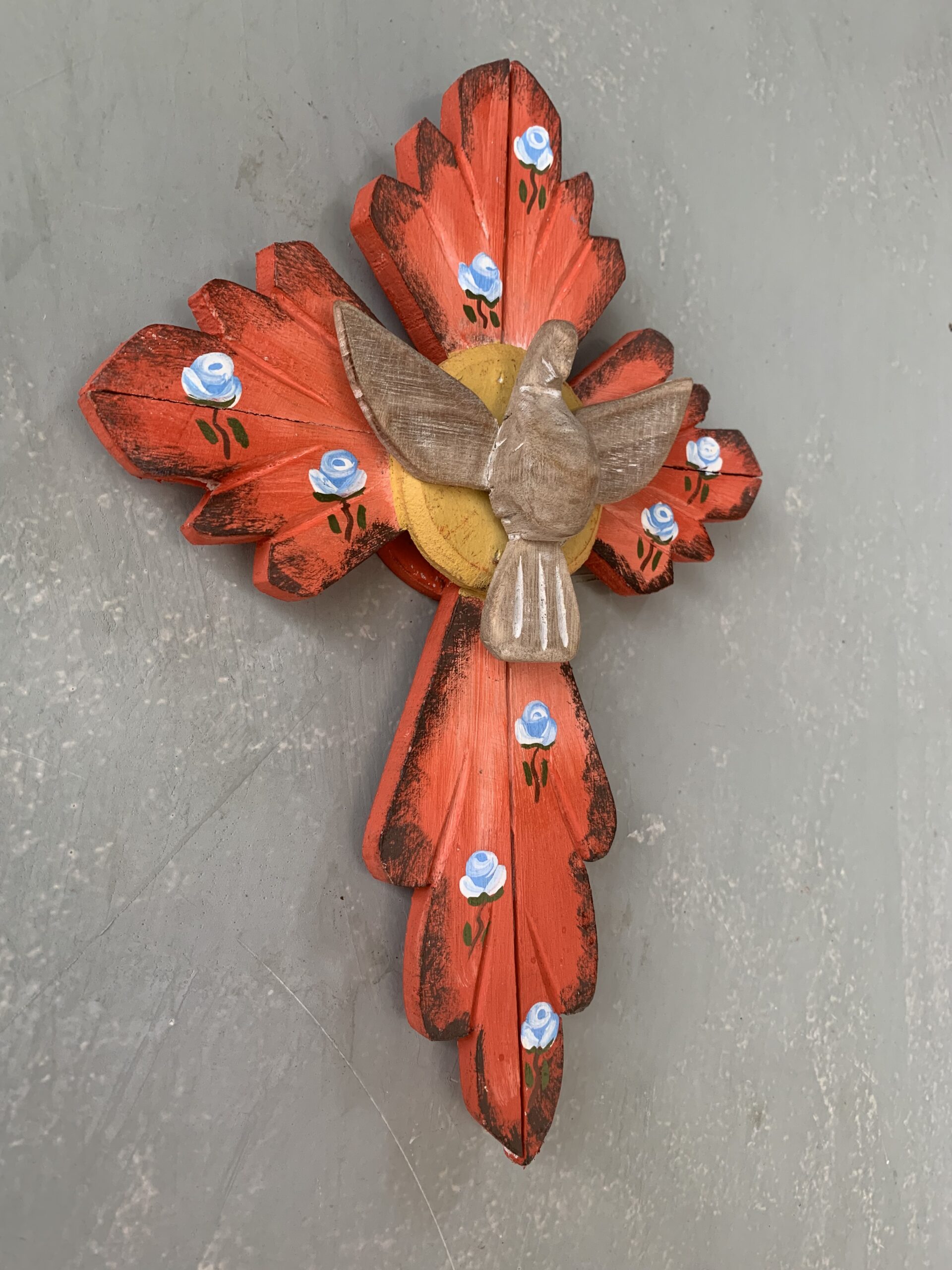 Cruz com divino Espírito Santo , esculpido e pintando a mão na madeira . Produto 100% artesanal